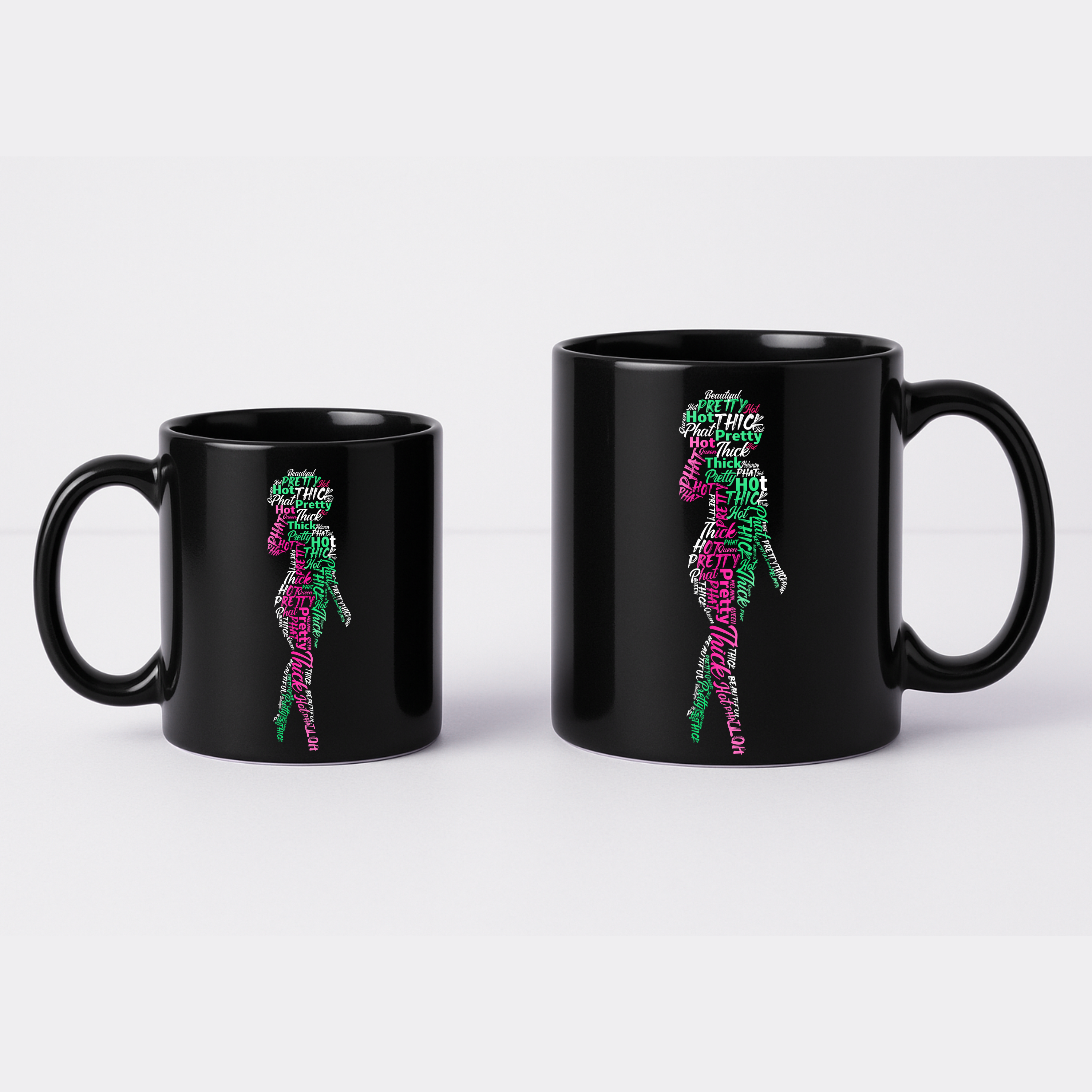 Our black mug with the stunning pink and green Afro Queen silhouette is made to order in order to help reduce waste and ensuring your mug is freshly printed just for you.
